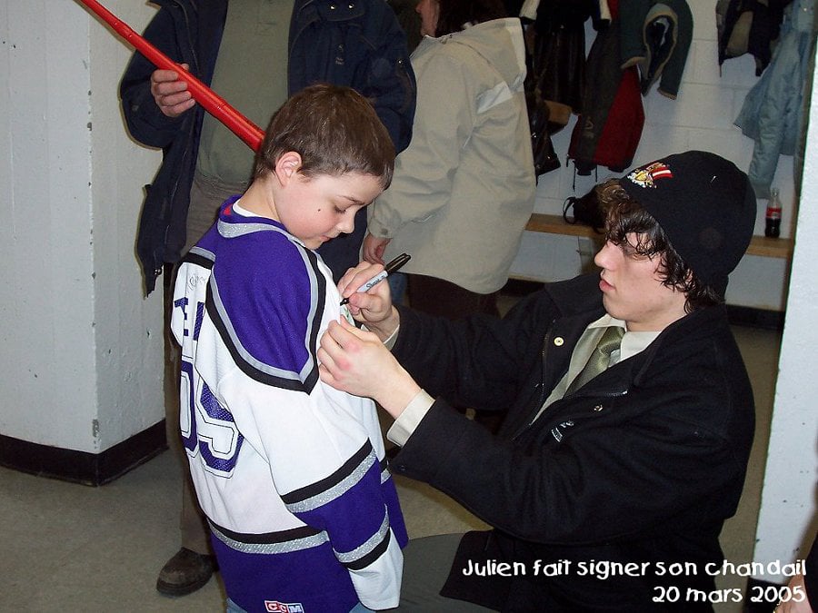 Tout comme l'année dernière, nous avons eu des billets pour aller voir jouer les Drakkars de Baie-Comeau. Malheureusement cette année, il n'y a pas eu de rencontre avec les joueurs ni de cadeaux. J'ai trouvé ça un peu « cheap » comparativement à l'année passée. Même Julien était déçu de ne pas rencontrer les joueurs. Mais bon, c'est pas si grave, on a quand même vu les joueurs. Et en plus, il y a eu une grosse bataille sur la glace, Francis et Julien étaient un peu déconcertés!